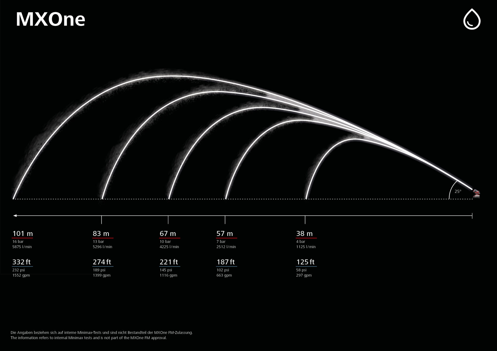 With MXOne, a wide range of fire scenarios can be safelymastered. The flexible applicability of different extinguishing media plays a key role. MXOne can be operated with townwater, salt water, with and without foam concentrate admixtures (also fluorine-free).